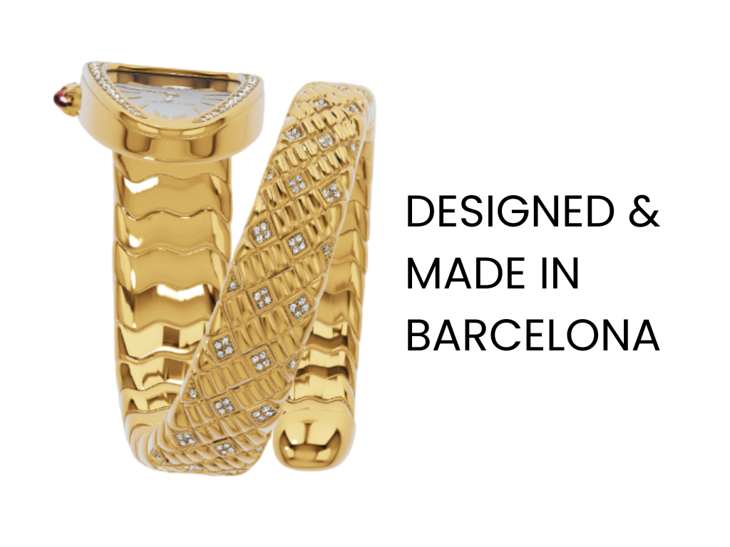 Crafted in Spain's jewelry workshops using techniques reserved for luxury houses. Hand-finished scales, precision-set crystals, gold polished until it catches light like silk.